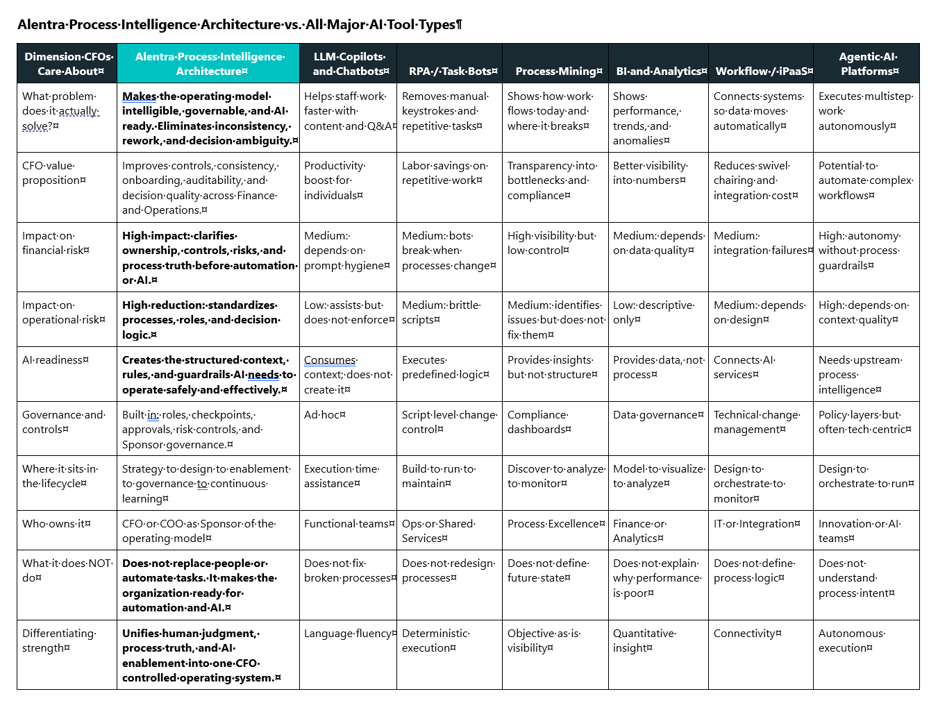 This page gives CFOs a clear view of the AI landscape and shows why the SSOS Agent is the only Business Side AI system designed for financial leadership.
