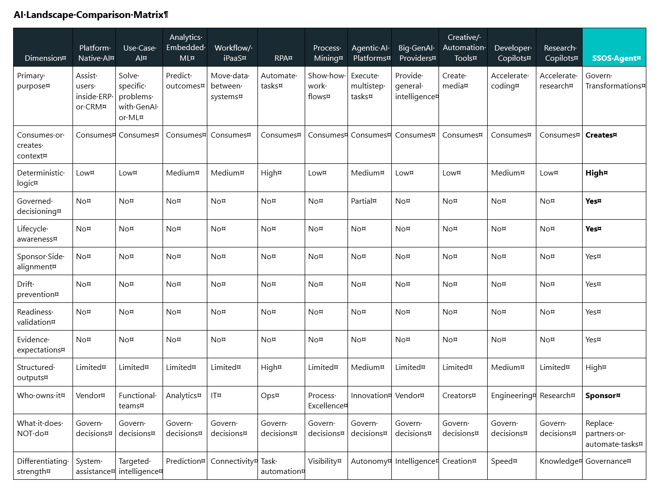 System‑side AI will continue to assist and accelerate work, but it cannot govern. It cannot prevent drift. It cannot protect value. It cannot enforce Sponsor intent. That is why the SSOS Agent exists today, and why the Process Intelligence Architecture matters even more tomorrow.