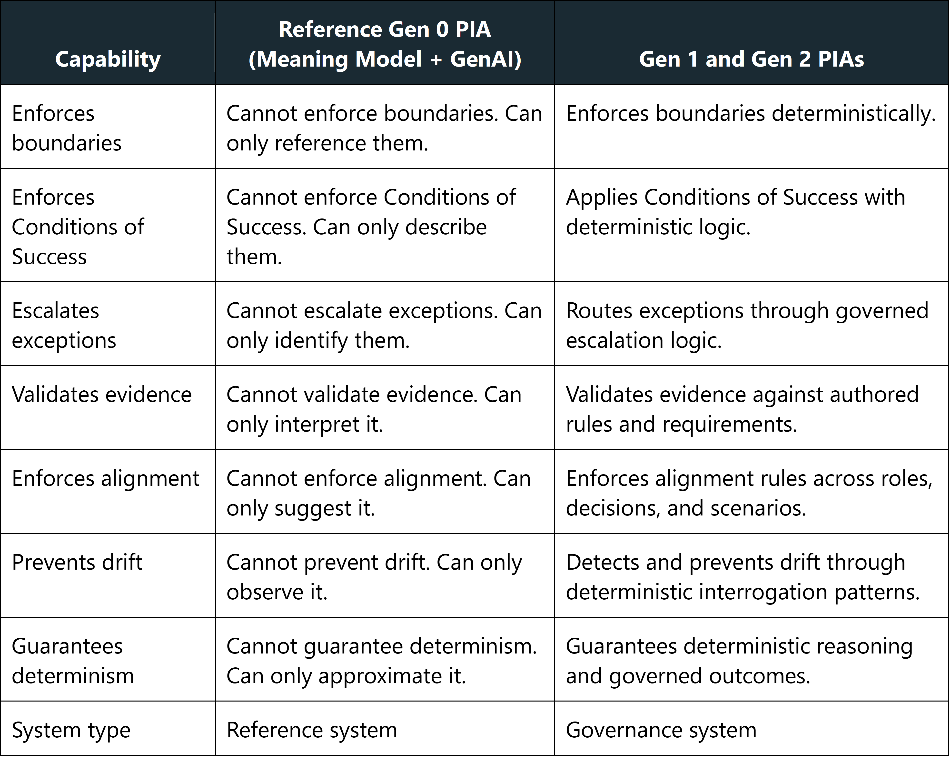 A Meaning Model combined with GenAI provides a valuable reference system, but it is not a PIA. It cannot enforce meaning, boundaries, or Conditions of Success. It cannot guarantee determinism or prevent drift. PIAs provide the governance layer that enterprises require for safe, aligned, and consistent AI-enabled operations.
